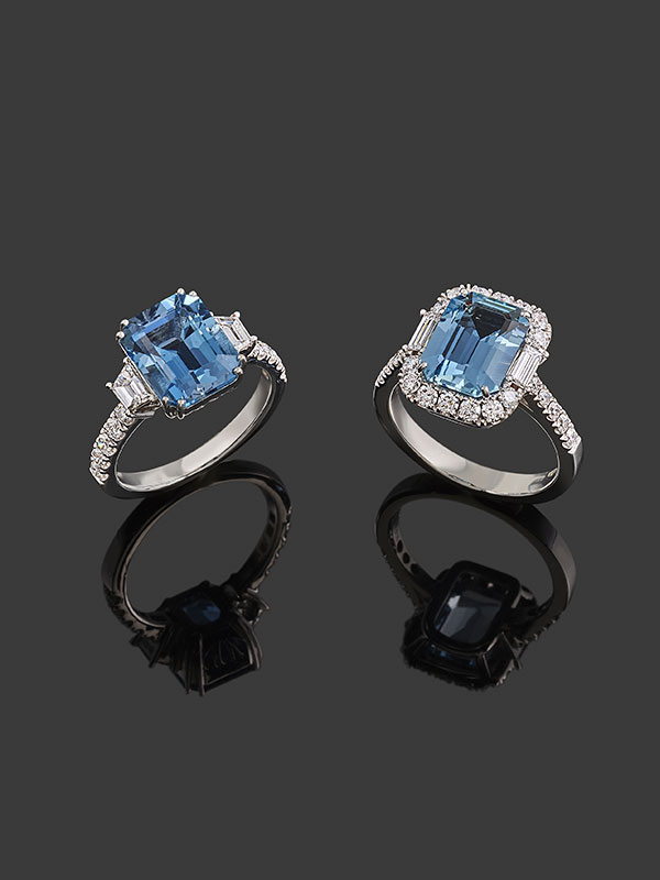 A sinistra elegante anello in oro bianco 18 kt, con al centro acquamarina ( colore Santa Maria ) nella classica forma ottagonale, affiancata da due diamanti trapezoidi e diamanti raglio brillante ad impreziosire il gambo. A destra, classico anello con acquamarina taglio ottagonale, contornata da diamanti taglio brillante e baguette. Pezzi unici.