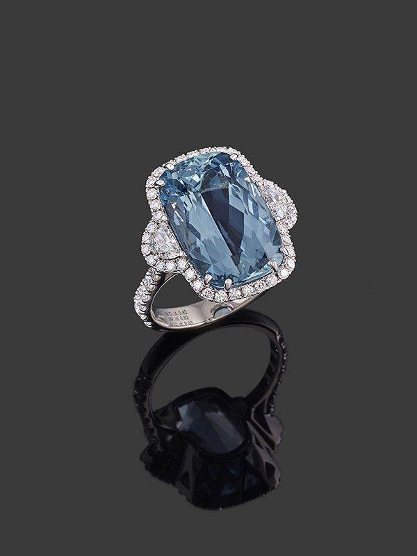 Importante anello in oro bianco 18 Kt con al centro acquamarina taglio cuscino di 9.97 carati. Ai lati due diamanti taglio mezza luna accompagnati da diamanti taglio brillante. Pezzo unico.