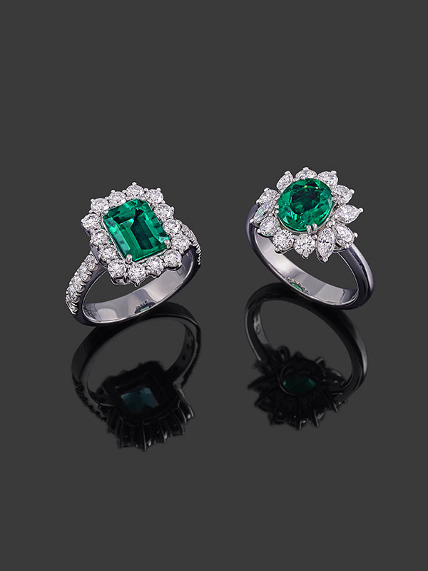 Classici anelli in oro bianco 18 kt, con centrale di smeraldo taglio ovale e ottagonale impreziositi con doppio contorno di diamanti taglio brillante.