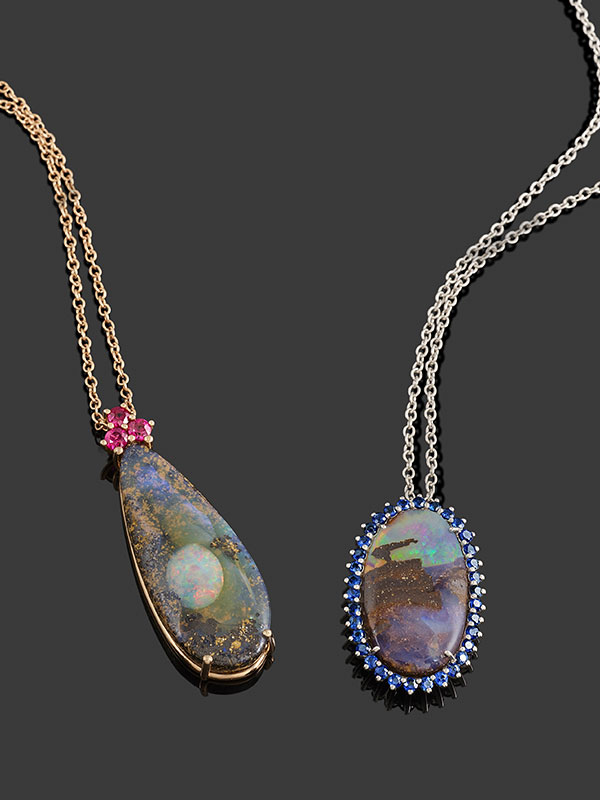 Originali pendenti in oro bianco e rosa 18 Kt con opali boulder, impreziositi da rubini e zaffiri. Pezzi unici