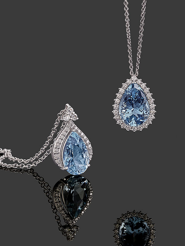 Girocolli pendenti in oro bianco 18 Kt, con eleganti gocce di acquamarina, impreziositi da diamanti taglio brillante. Pezzi unici.