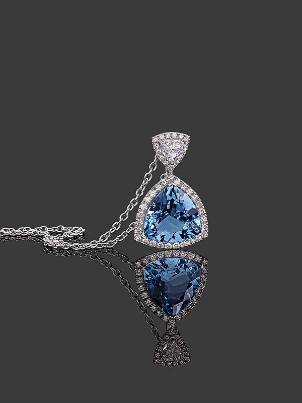 Originale girocollo pendente in oro bianco 18 Kt. Al centro un'acquamarina dalla rara forma a trilion, contornata da diamanti taglio brillante e un diamante taglio trillion.