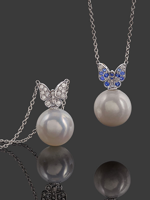 Simpatici girocolli in oro bianco 18 Kt con perle fresh water e farfalle con zaffiri e diamanti taglio brillante.